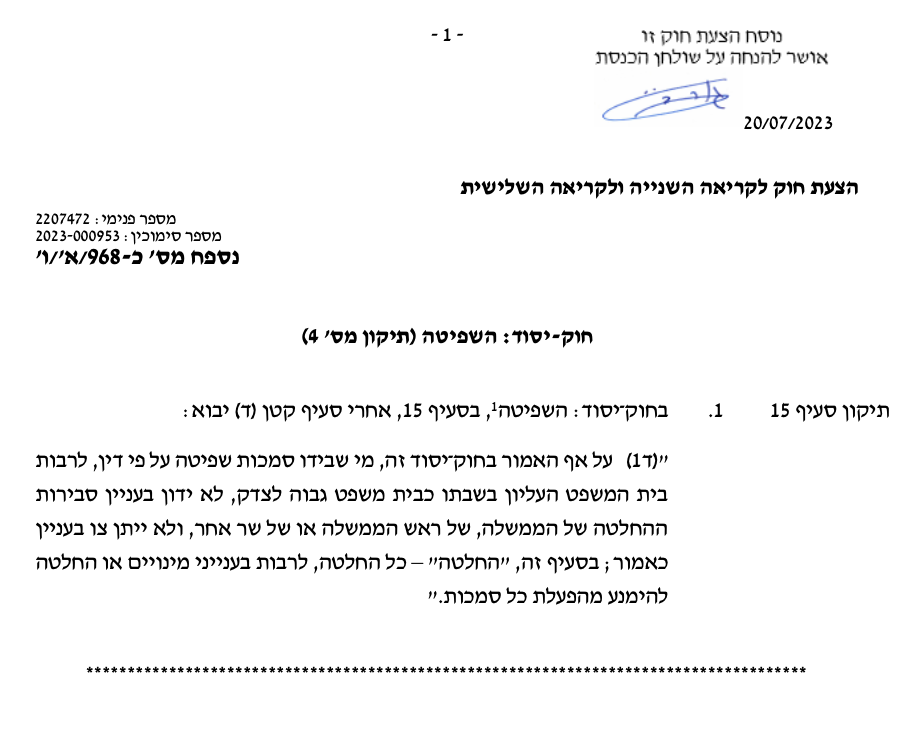 Несмотря на сказанное в этом Основном законе, те, кто обладает судебной властью в соответствии с законом, включая Верховный суд, заседающий в качестве Высшего суда Справедливости, не будет обсуждать вопрос о разумности решения Правительства, премьер-министра или иного министра, и не будет издавать решения по вышеупомянутому вопросу; в этом разделе: "решение" - любое решение, включая вопросы о назначениях или решение воздержаться от осуществления каких-либо полномочий.