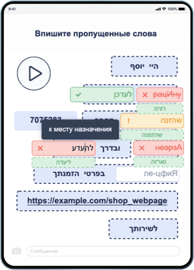 Уровень 3. Напишите пропущенные слов на иврите, воспользуйтесь подсказками по звучанию. Исправляйте пока не станет правильно :)