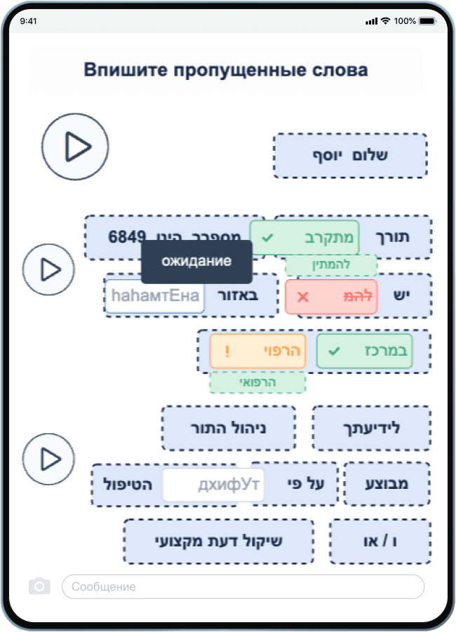 Уровень 3. Напишите пропущенные слов на иврите, воспользуйтесь подсказками по звучанию. Исправляйте пока не станет правильно :)